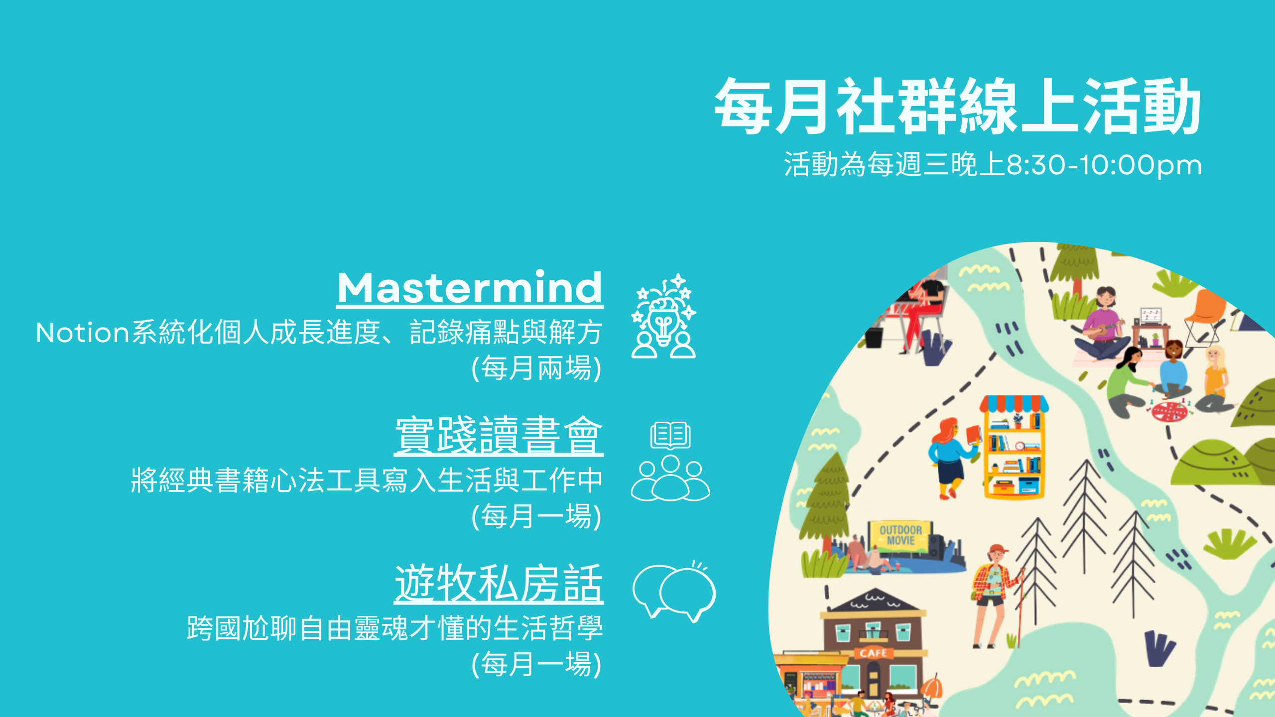 每月四大主題活動都很豐富,也會完整收錄活動簡報、錄影和統整在共享的平台,隨時可以回顧。」