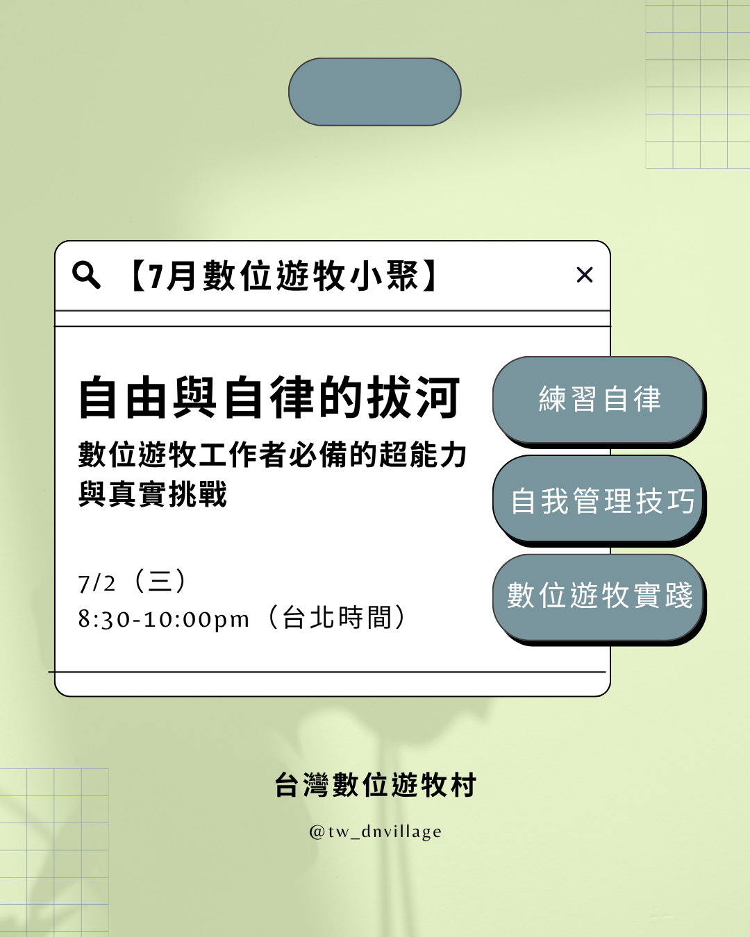 💻7/2數位遊牧小聚|自由與自律的拔河:數位遊牧工作者必備的超能力與真實挑戰 每個人都羨慕數位遊牧的自由,但自由的背後,是不斷與自我鬥爭與自律的日常!來聊聊大家如何面對拖延、自我懷疑與紀律建立,以及如何找到工作節奏與生活平衡。